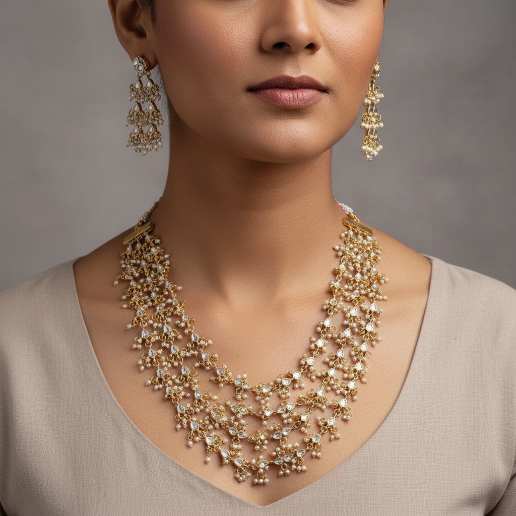 Looking for a Jewellery Set for Wedding and Party? The Pink Pearl Mehira Multilayer Necklace Set is an ideal choice. Its luxurious design and shimmering pearls make it a standout piece for brides and bridesmaids alike. This necklace set effortlessly captures the essence of celebration, making it a timeless addition to your Wedding Collection Jewellery. Pair it with a saree, lehenga, or even a modern gown, and watch heads turn as you enter the room.